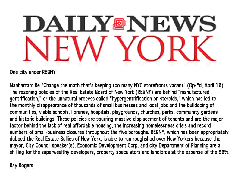 "Manhattan: Re "Change the math that's keeping too many NYC storefronts vacant" (Op-Ed, April 16). The rezoning policies of the Real Estate Board of New York (REBNY) are behind "manufactured gentrification," or the unnatural process called "hypergentrification on steroids," which has led to the monthly disappearance of thousands of small businesses and local jobs and the bulldozing of communities, viable schools, libraries, hospitals, playgrounds, churches, parks, community gardens and historic buildings. These policies are spurring massive displacement of tenants and are the major factor behind the lack of real affordable housing, the increasing homelessness crisis and record numbers of small-business closures throughout the five boroughs. REBNY, which has been appropriately dubbed the Real Estate Bullies of New York, is able to run roughshod over New Yorkers because the mayor, City Council speaker(s), Economic Development Corp. and city Department of Planning are all shilling for the superwealthy developers, property speculators and landlords at the expense of the 99%. Ray Rogers"