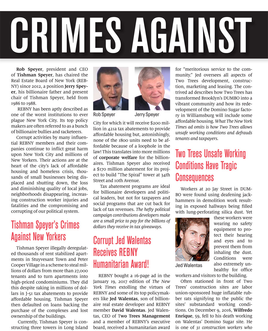 REBNY's billionaire bullies rake in unneeded billions of dollars in tax abatements and subsidies deemed corporate welfare, supports privatization of public services and undermines public education, public housing, rent stabilization, stability of small businesses and healthcare for all.