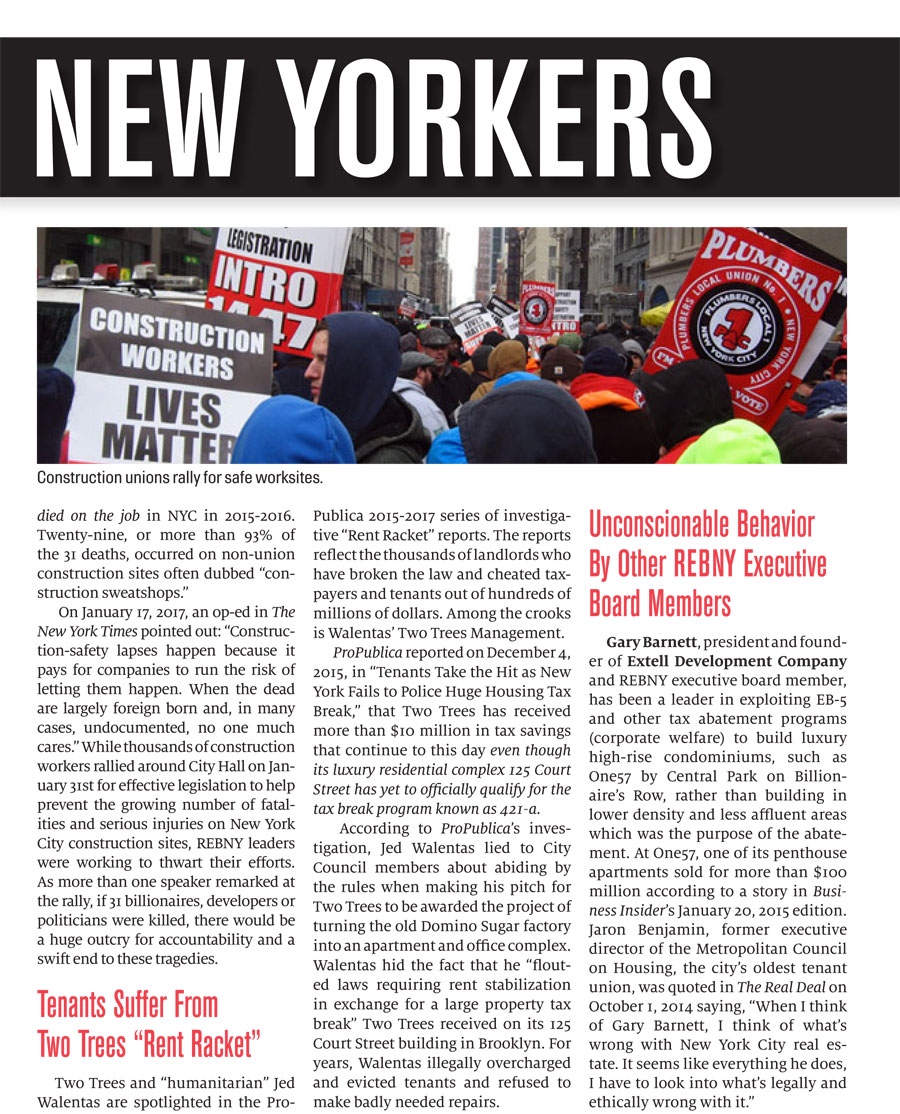 "Members of REBNY's Board of Governors like Tax Cheat Stephen Ross of Related Companies (net worth $7.6 billion), President Trump's close friend Richard LeFrak of LeFrak Organization who wants to end rent stabilization (net worth $6.3 billion), Thieves Jerry and Rob Speyer of Tishman Speyer (net worth $3.9 billion), and Thieves David and Jed Walentas of Two Trees Management (net worth $2.1 billion) think union construction workers are grossly overpaid!" —Ray Rogers, director, Campaign to Stop REBNY Bullies