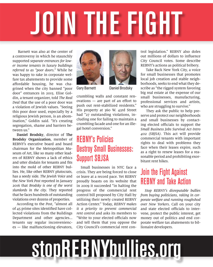 Other top policymakers of REBNY include Gary Barnett who staunchly supported separate entrances for lower income tenants in luxury buildings referred to as "poor doors." Fortunately after public outcries, NYC banned poor door entrances. Unfortunately, slumlords like Daniel Brodsky and others like him are welcomed members of REBNY's Executive Board and Board of Governors.